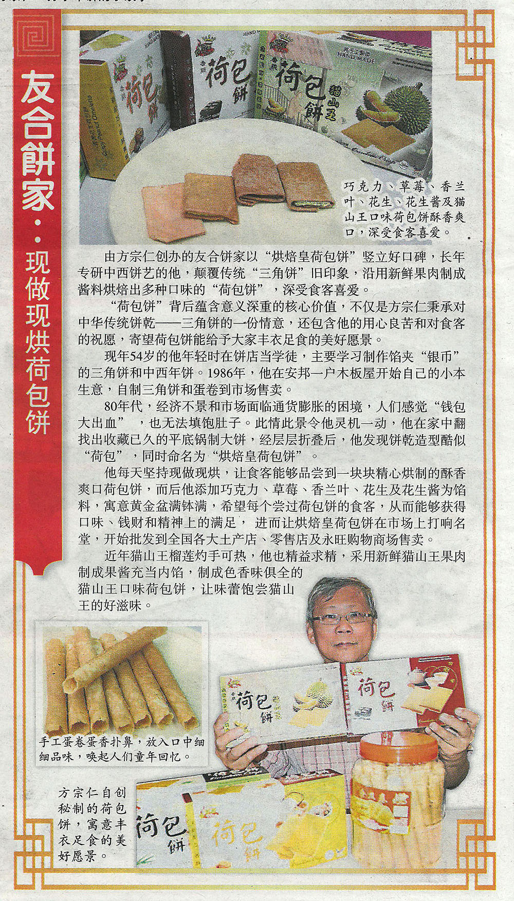 “友合饼家”是由方宗仁师傅所创办。他长期醉心于中西饼艺,凭着坚持和努力,经持续研发、改良与提升,方师傅首创了新鲜现做,深受食客欢迎的“荷包饼”。